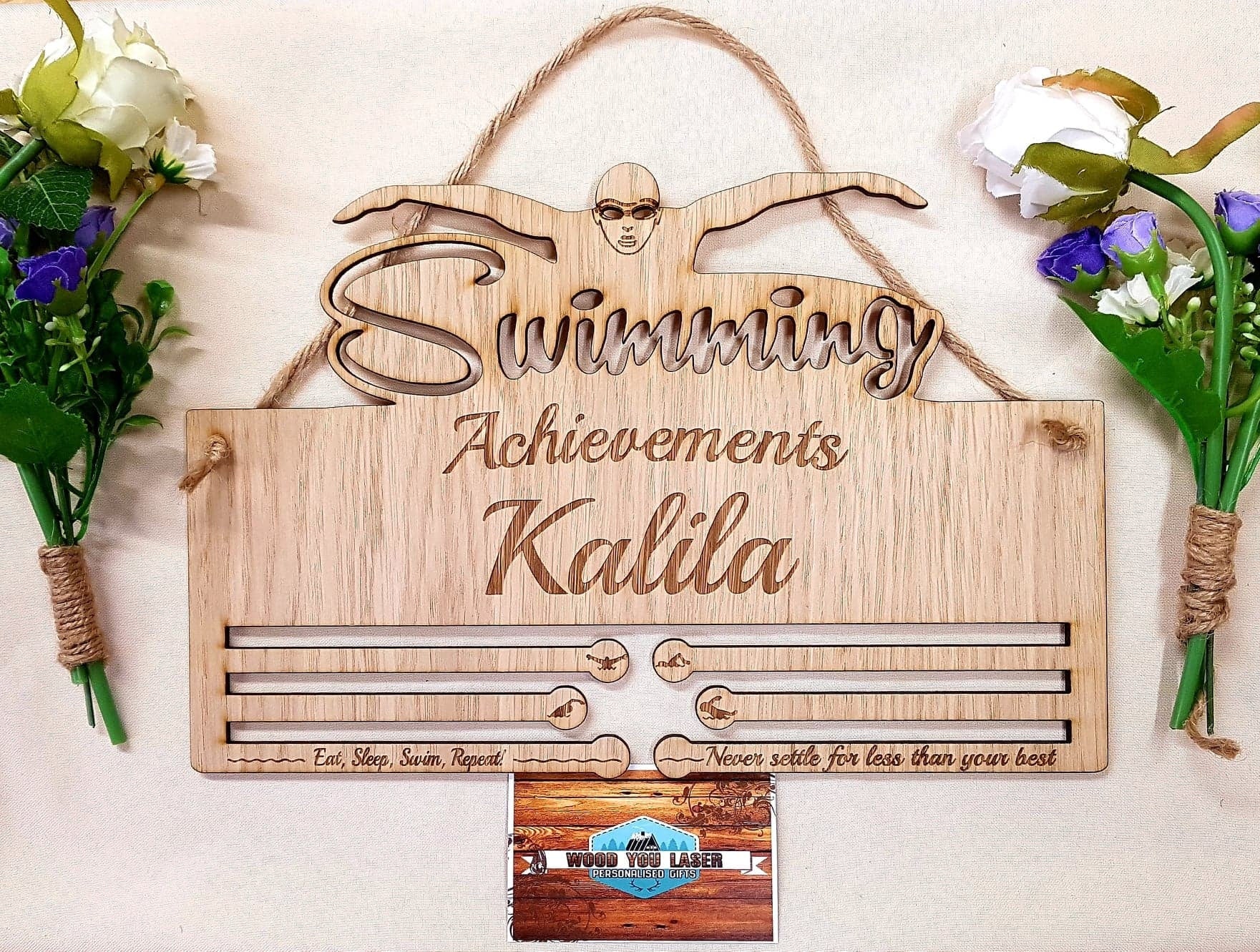 A small burn residue is present on the edge of the piece which adds to the character of it, if it's not your thing simply wipe it off with a damp cloth or similar. Suitable for Gifts, Birthdays, Christmas, End of Season awards etc. Personalised with a name of your choice.... member of a grassroots swimming team and have the rights to your club logo? Get in touch and we can include the club badge on your hanger.