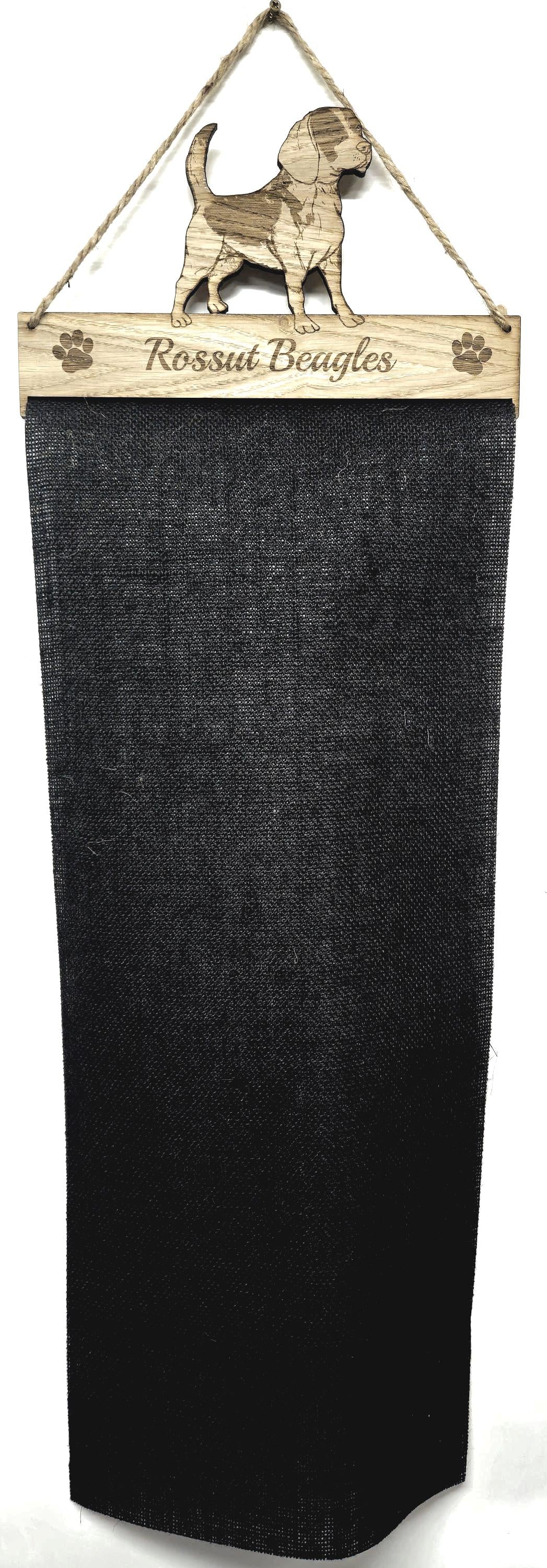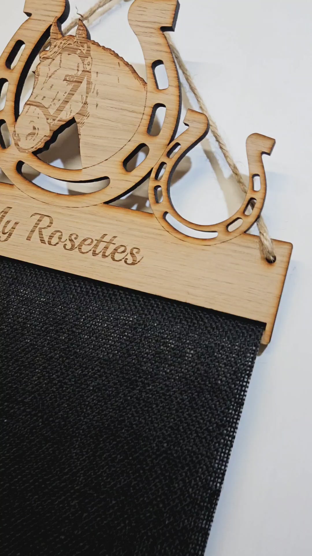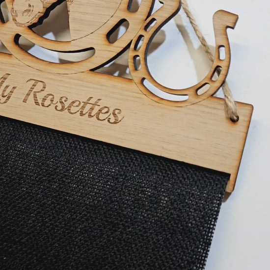 Made from sturdy 6mm oak veneer MDF along with extremely durable black Hessian UPVC Jute cloth and with UK postage, what better way to display your favourite rosettes than with one of our personalised holders.