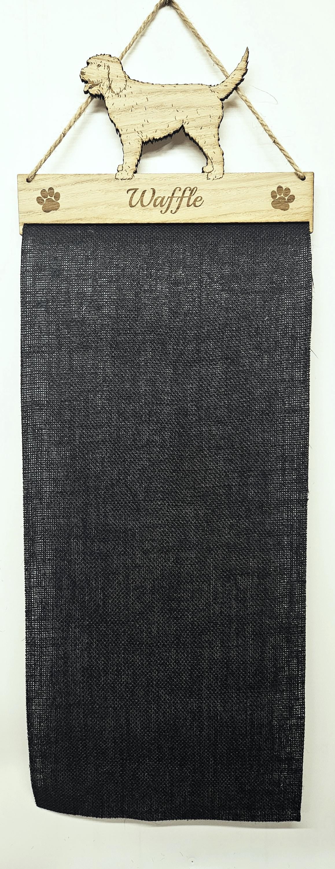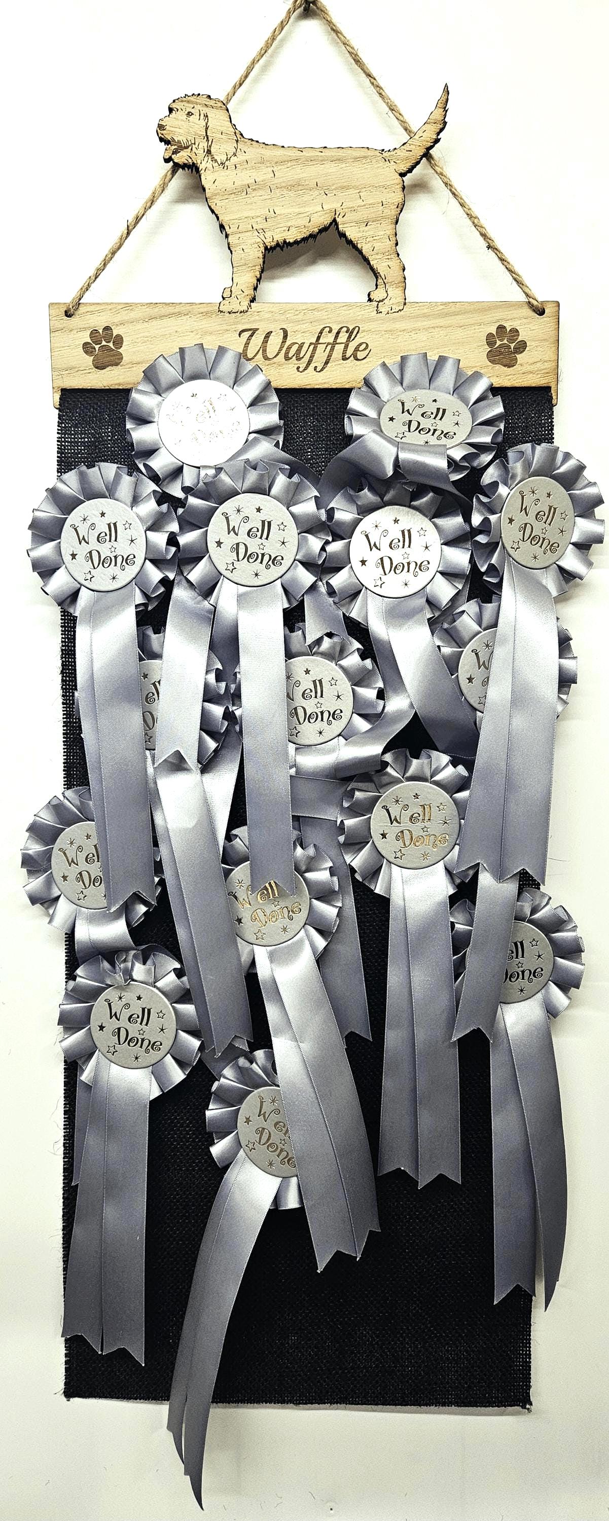 Made from sturdy 6mm oak veneer MDF along with extremely durable black Hessian UPVC Jute cloth, what better way to display your favourite rosettes than with one of our personalised holders.