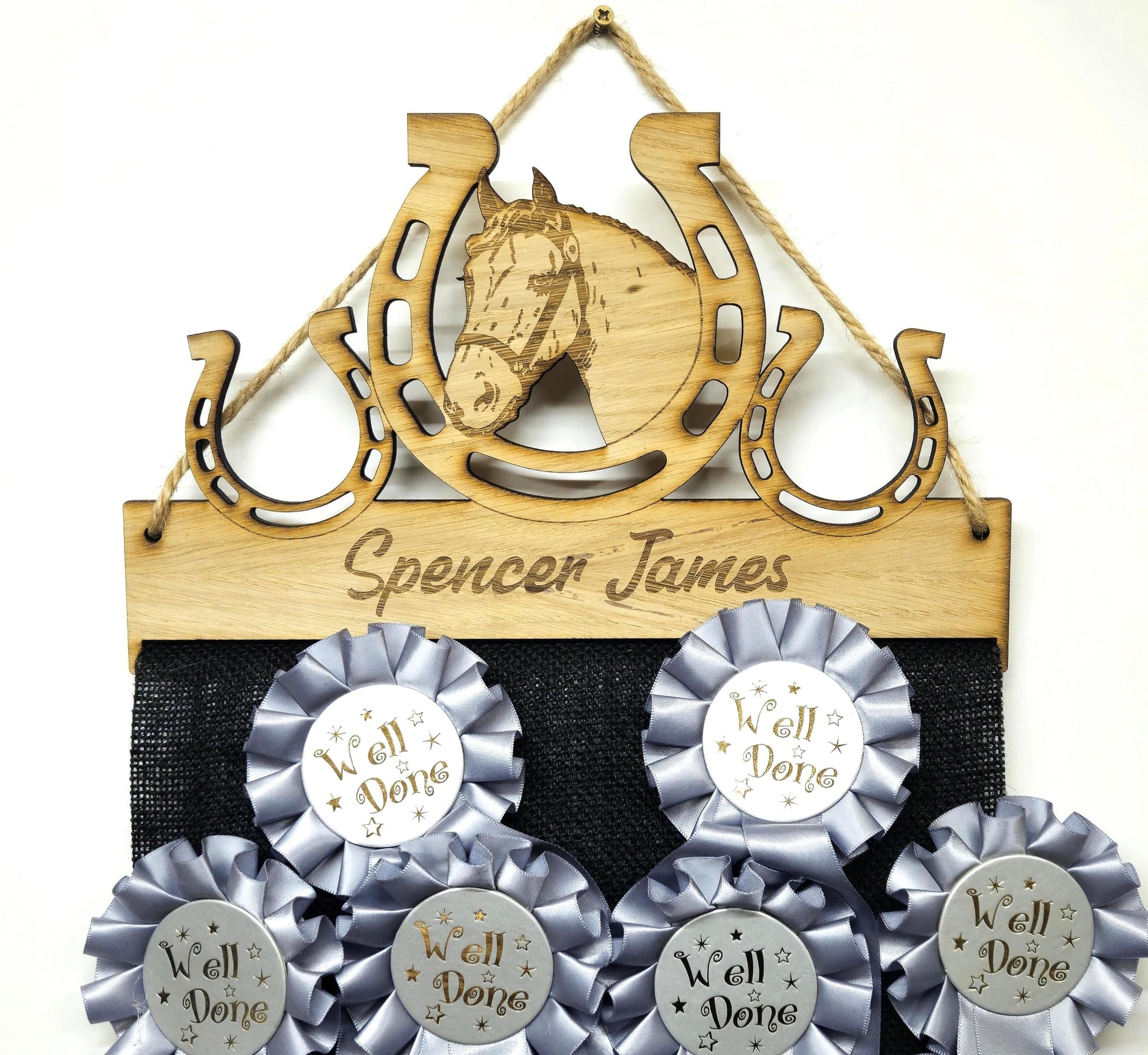 Rosette Holder Horse in Shoe Design: Personalised 6mm Oak Veneer Rosette Hanging Gift