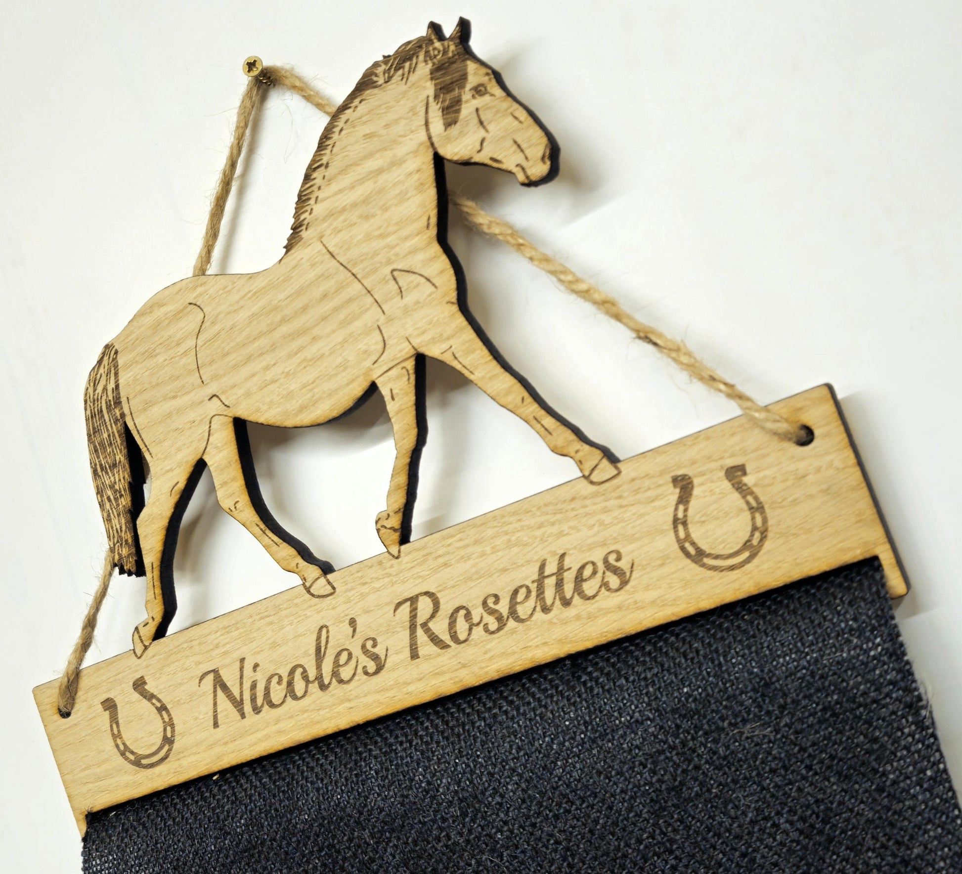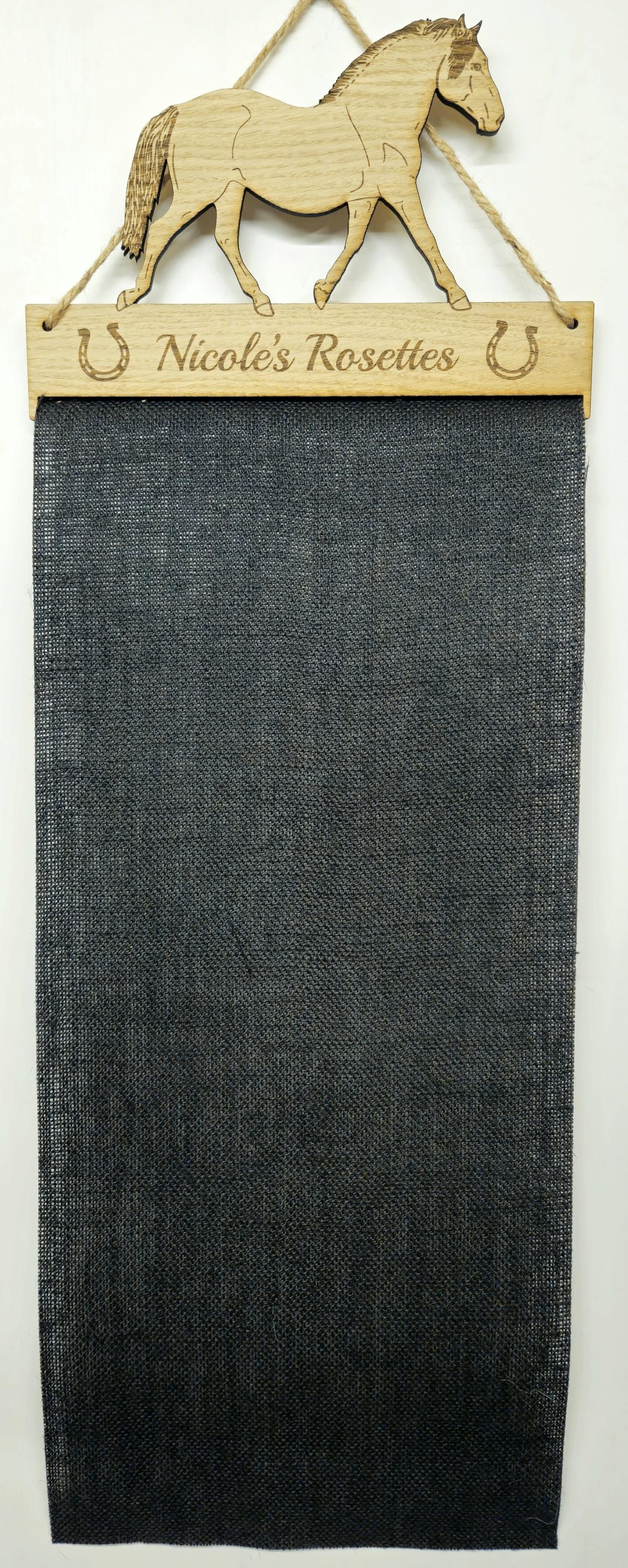 Made from sturdy 6mm oak veneer MDF along with extremely durable black Hessian UPVC Jute cloth, what better way to display your favourite rosettes than with one of our personalised holders.